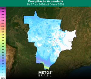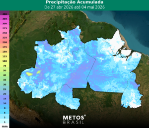O mapa de precipitação acumulada indica chuvas bem distribuídas na maior parte da região, com volumes mais expressivos concentrados entre os estados do Amazonas e do Pará. Em contrapartida, o Amapá tende a registrar os menores acumulados pluviométricos do período, apresentando intervalos sem precipitação. No Tocantins, as chuvas devem ocorrer de forma mais significativa na porção norte, contribuindo para a manutenção da umidade do solo.