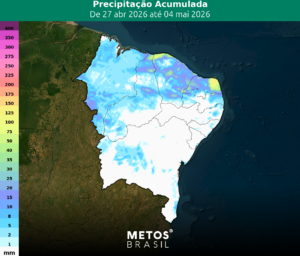 O mapa de precipitação acumulada indica volumes semanais mais elevados concentrados na faixa norte da região, com possibilidade de transtornos pontuais em áreas urbanas e rurais. Por outro lado, grande parte do interior nordestino deve seguir com predomínio de tempo firme e maior presença de sol ao longo do período.