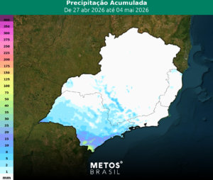 O mapa de precipitação acumulada indica que os volumes mais expressivos devem se concentrar no extremo sul de São Paulo e na faixa litorânea. Nas demais áreas da região, são esperadas chuvas pouco significativas ou até ausência de precipitação ao longo do período. Esse cenário favorece boas janelas de trabalho para colheita e tratos culturais na maior parte do Sudeste, com atenção voltada à gestão hídrica nas áreas sob predomínio de tempo seco.