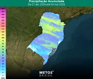 O mapa de precipitação acumulada indica a ocorrência de chuvas bem distribuídas em toda a Região Sul, com os maiores volumes concentrados entre o centro-sul do Paraná e o oeste de Santa Catarina. Em contrapartida, o sudoeste do Rio Grande do Sul tende a registrar os menores acumulados ao longo do período.
