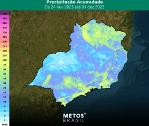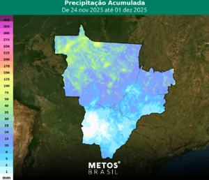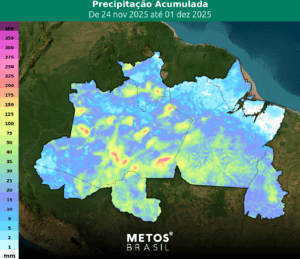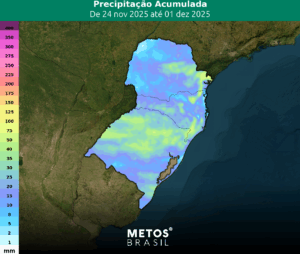Segundo a previsão acumulada entre os dias 24 de novembro e 1º de dezembro, os volumes de precipitação devem se concentrar principalmente sobre o centro-norte do Rio Grande do Sul, o leste de Santa Catarina e o Paraná, com acumulados variando entre 40mm e 70mm em grande parte dessas áreas. No extremo sul gaúcho, os volumes serão mais baixos, enquanto nas faixas centrais do estado os índices tendem a ser mais significativos, especialmente no domingo, com a intensificação de um novo sistema frontal.