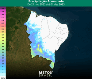 Com base no mapa de precipitação acumulada para esta semana, observa-se que os maiores volumes de chuva no Nordeste ficarão concentrados no sul e oeste da Bahia, além do sul do Maranhão e Piauí. Nessas localidades, os acumulados variam entre 50mm e 100mm, reforçando a tendência de instabilidades mais expressivas no início da semana.