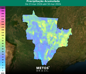 O mapa de precipitação acumulada indica que a faixa centro-leste de Goiás receberá os maiores volumes da região ao longo do período. O monitoramento também mostra que todo o Centro-Oeste registrará chuvas durante a semana, embora com volumes distintos. o Mato Grosso do Sul, especificamente, apresentará índices inferiores em comparação ao norte da região. No entanto, apesar desses volumes menores, o estado sul-mato-grossense registrará uma importante recuperação da umidade do solo ao longo do período, favorecendo a manutenção hídrica das lavouras de segunda safra.