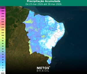 Em relação ao comportamento térmico, a ausência de chuvas frequentes em grande parte do interior favorecerá a ocorrência de temperaturas elevadas, o que intensificará a evapotranspiração nas lavouras. Por outro lado, a região sul da Bahia, que contará com a presença constante de instabilidades e cobertura de nuvens, não apresentará elevação significativa das temperaturas, mantendo um regime térmico mais ameno em comparação ao restante do Nordeste.