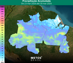 O mapa de precipitação acumulada indica que os maiores volumes da semana se concentrarão na faixa central da região, com destaque para o Amazonas e o Pará, onde os totais poderão ser significativos. Em contrapartida, áreas ao norte de Roraima e do Amapá observarão chuvas mais isoladas e menores volumes acumulados ao longo do período. Essa distribuição garantirá a manutenção de bons níveis de umidade no solo para a maioria das áreas produtoras, embora o excesso pontual no leste do Pará demande atenção para evitar problemas fitossanitários decorrentes da alta umidade.