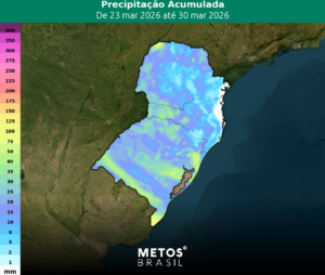 O mapa de precipitação acumulada indica que os maiores volumes se concentrarão no sul do Rio Grande do Sul, em função do posicionamento dos sistemas meteorológicos. Em contrapartida, a faixa leste de Santa Catarina e do Paraná registrarão baixos volumes ou até mesmo ausência de chuva significativa ao longo do período.