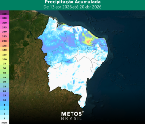 Os maiores acumulados se concentram na faixa norte, com destaque para o Ceará. Já o interior, especialmente do sul do Piauí à Bahia, terá chuvas irregulares e de baixo volume, o que pode limitar a reposição hídrica.