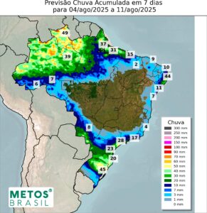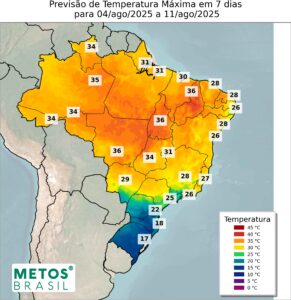 A Região Centro-Oeste terá uma semana marcada pelo domínio de uma potente massa de ar seco e quente, que atuará como um bloqueio atmosférico, garantindo tempo firme e estável na maior parte da região. A única exceção a esse padrão ocorrerá no início da semana, quando a passagem de uma frente fria pelo Sul do país poderá influenciar o tempo no sul e oeste de Mato Grosso do Sul, trazendo chance de chuva isolada e de curta duração entre segunda e terça-feira. Para as demais áreas — como Mato Grosso, Goiás e o Distrito Federal — a previsão é de ausência quase total de chuvas, reforçando o padrão climatológico de um dos meses mais secos do ano.